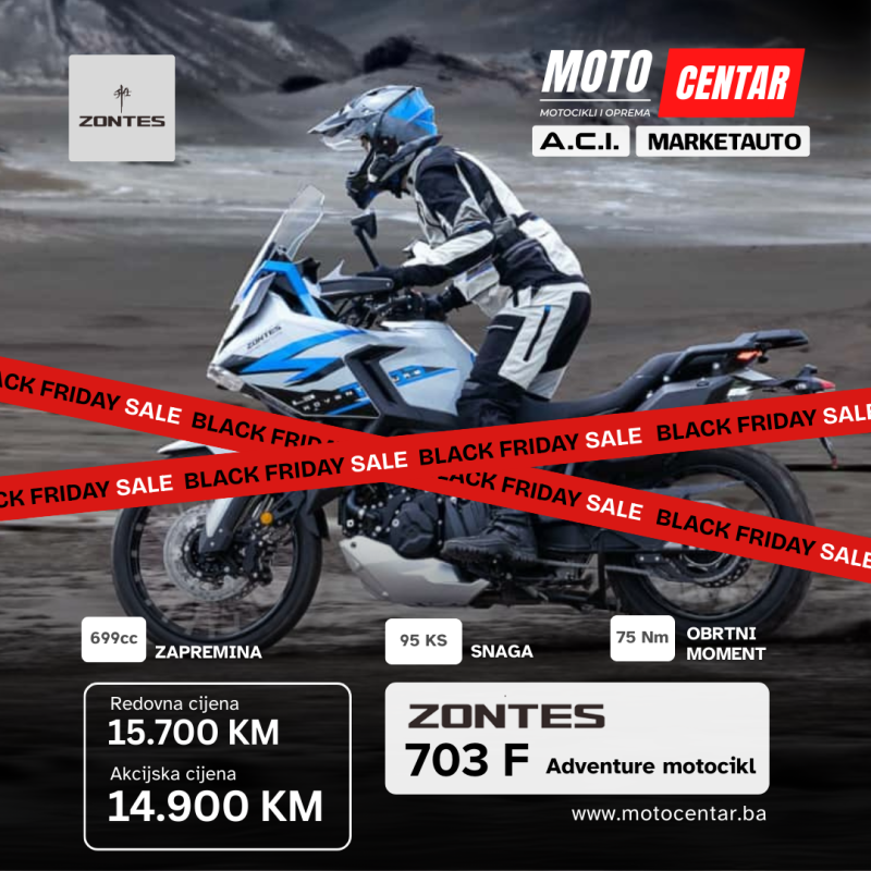 Black Friday u MOTOCENTAR.BA je odlična prilika za kupovinu novog motocikla po sniženoj cijeni, s garancijom i podrškom stručnog tima. Bilo da tražite sportski model, avanturistički touring ili praktičan gradski skuter, u ponudi ćete pronaći opcije s pravom vrijednošću za uloženi novac. Rezervišite odmah i vozite sigurno!