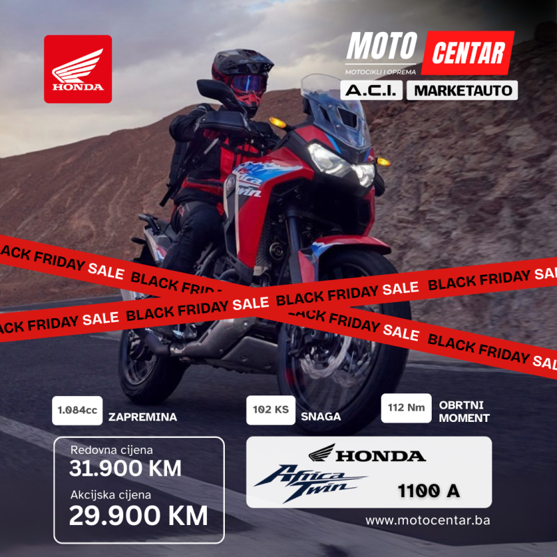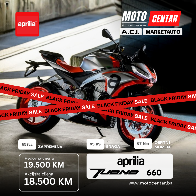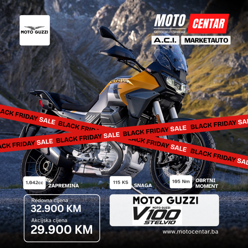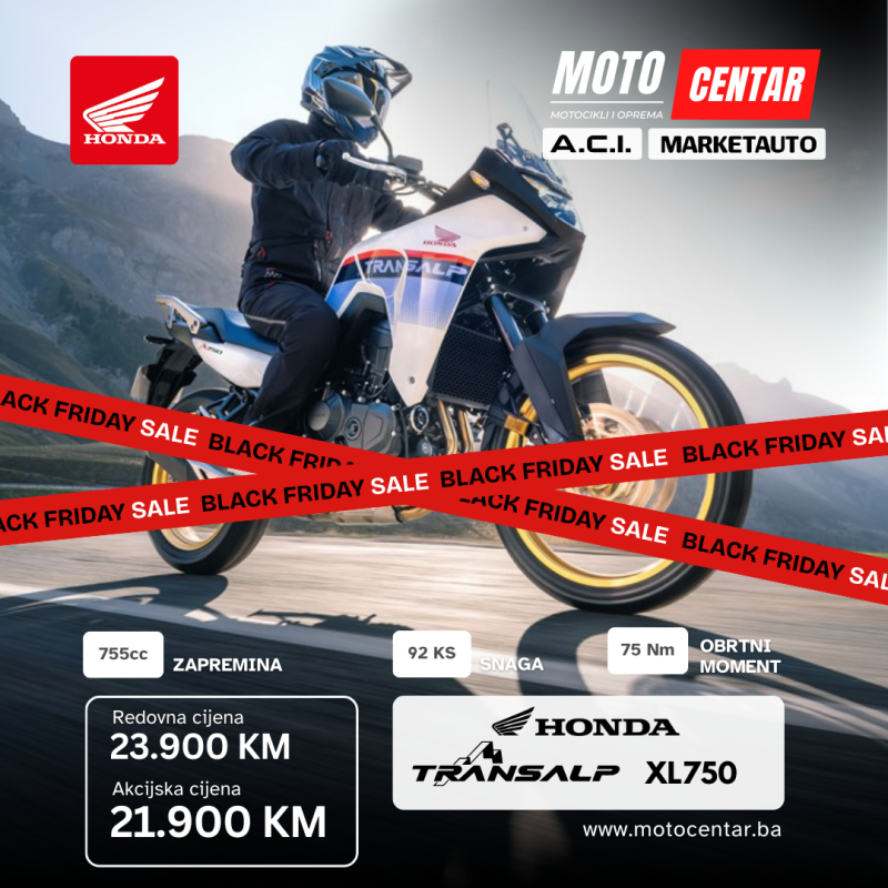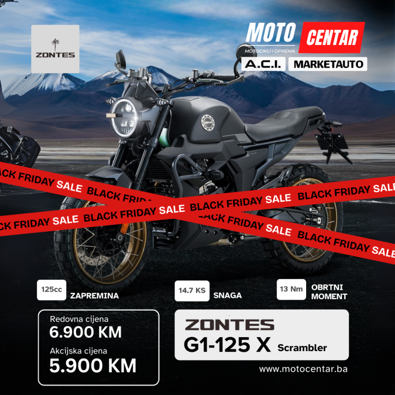 Stiže Black Friday i kod nas u MOTOCENTAR.BA spremili smo posebnu ponudu za sve ljubitelje motocikala. Za ograničeno vrijeme nudimo izabrane nove modele po sniženim, akcijskim cijenama — idealna prilika za kupovinu sigurnog, provjerenog i servisiranog motora uz značajne uštede.